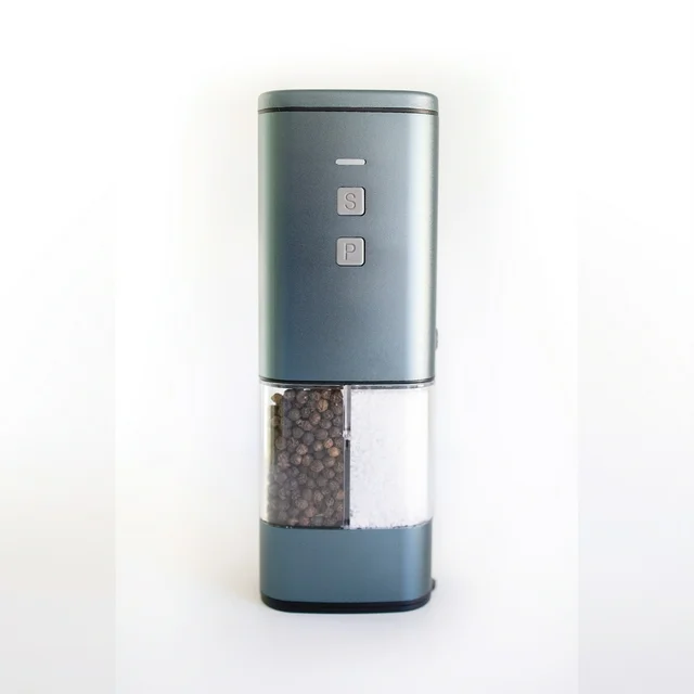 - Product features: High-grade aluminum oxidation process Two containers for Sea salt and black pepper Two buttons to operate(S for salt, P for Pepper) Has a LED light on the bottom High resistance ceramic mechanism Can adjust Fine or coarse USB-C Rechargeable lithium battery inside, can last using 30-40 minutes. Only need charge it once per 3 or 4 weeks